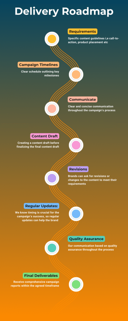 - Defined Campaign Timelines: Once a campaign brief is confirmed, we provide a clear schedule outlining key milestones such as influencer selection, content creation, campaign launch, and reporting dates by communicating with influencer.